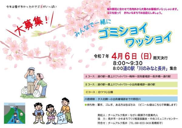 もうすぐ桜の季節!桜の開花に合わせて市内外から大勢のお客様がいらっしゃいます。ゴミを拾って、綺麗なまちでお出迎えしましょう。 開催日:4月6日(日) 雨天決行時間: 8:00~9:30 (8:00道の駅川のみなと長井集合)持ち物:軍手・ゴム手・ある方は缶ばさみ (ビニール袋はこちらで準備します) コース紹介Aコース:道の駅〜最上川フットパス〜梅林~宮舟着場跡〜長井橋〜道の駅Bコース:道の駅〜最上川フットパス〜小出舟着場跡〜道の駅Cコース:白つつじ公園川底掃除:タス北側〜小出舟着場跡までの野呂川 皆様のご参加お待ちしております。 チームアルク長井