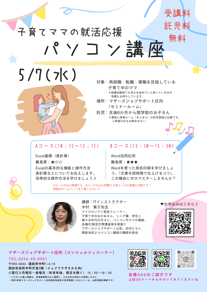 ☆マザーズジョブサポート庄内主催☆毎回大人気!『パソコン講座』のお知らせ ≪Aコース≫ 5月7日(水)10:15〜12:15『Excel基礎(表計算)』Excelの基本的な機能と操作方法 表計算などについてお伝えします。効率的な操作方法を学びましょう♪ ≪Bコース≫ 5月7日(水)13:30〜15:30『Word活用応用』Wordを使った宛名印刷を学びましょう。「文章を短時間で仕上げるコツ」、この機会にぜひマスターしませんか? ♪片方のコースのみ、両方のコース、どちらの受講でも可能です♪【対 象】再就職・転職・復職を目指している子育て中のママ※就職活動前で何かを始めたいママもOK【会 場】マザーズジョブサポート庄内 セミナールーム【料 金】受講料 及び 託児料 無料【託 児】※事前登録・予約が必要です。 保育ルーム開室日【水・木・金】の 10:00〜16:00に登録にお越し下さい。 ※併設の保育ルームで、保育スタッフが お子さんをお預かりします。 ママは安心して受講いただけます。 【駐車場について】お車でお越しの際は、中町庁舎脇にあるセントラルホテル契約駐車場をご利用ください。(ジョブプラザさかたと表示してあります。)※契約駐車場が満車の場合は、酒田市中央地下駐車場をご利用ください。無料駐車券(最大2時間)を発行いたします。お帰りの際に、コンシェルジュ窓口へお声がけください。どうぞ、お気軽にお問い合わせくださいね。◇お申込み・お問い合わせ◇マザーズジョブサポート庄内TEL:0234-28-8061メールでのお申込みはコチラ