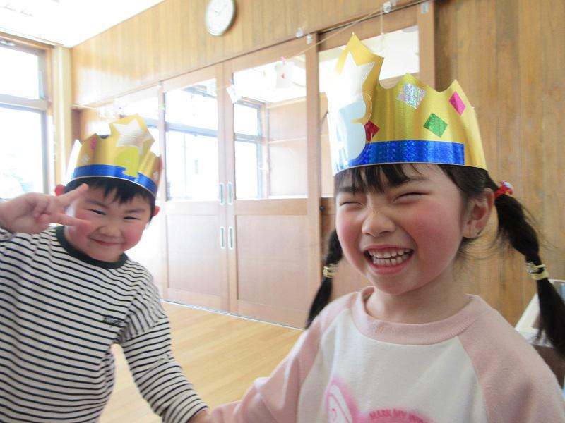 3月14日に、3月生まれのお誕生会が行われました。今月の誕生児は3名でした。誕生児はみんなの前でドキドキしながらも、鉄棒ブランコや鉄棒、縄跳びを披露してくれました。保育者の出し物は絵本『ともだちになろうよ』のペープサートでした。うさぎとわにが友達になっていく話に夢中になっていた子どもたちでした。