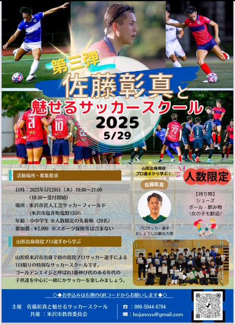 佐藤彰真と魅せるサッカースクールが5月29日に開催されます。日時 2025年5月29日(木)19時〜21時(18時30分〜 受付開始)場所 米沢市営人工芝サッカーフィールド年齢 小中学生(先着順 20名)参加費 2,000円持ち物 シューズ、ボール、飲み物主催 佐藤彰真と魅せるサッカースクール共催 米沢市教育委員会 お申込み電話 090−5944−6704メール hojunoyu@gmail.com ぜひ、海外で培ったメンタルとテクニック、経験を学びにいらしてください〜