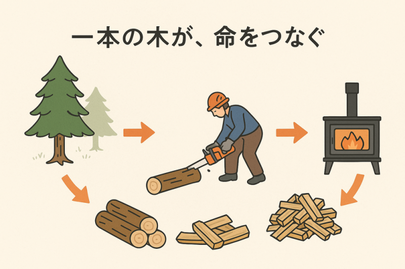 はじめに山に立つ一本の木。それは、ただの“木材”ではありません。人の手によって選ばれ、伐られ、整えられ、そして“薪”として新たな命を吹き込まれる──。今回は、一本の木が人の暮らしにぬくもりを届けるまでの道のりを追ってみたいと思います。山の中で、その木は選ばれる森の中に立ち、一本の木を見定める。それは私たちにとって、最初の大切な仕事です。間伐であれば、混み合った樹木の中から、成長を妨げる木を選びます。皆伐の場合でも、地形や水の流れ、後の植林のことまで考えて、一本一本に目を向けます。木を倒す瞬間には緊張感が走ります。周囲の安全、木の倒れる方向、風や地面の状態──自然を相手にする私たちは、常に謙虚でなければなりません。命を活かすための手入れ伐られた木は、すぐに次の工程へと進みます。枝を払い、一定の長さに玉切りし、用途に合わせて造材していきます。これらの作業は、薪の品質を左右する“命を活かす”手仕事です。チェーンソーやハーベスターなどの機械を使いながらも、最終的な判断はすべて人の目と感覚。太さ、曲がり具合、節の位置、樹皮の状態──細かな観察と経験が物を言います。山の中で加工された木は、フォワーダやトラックで土場へと運ばれます。その時点でようやく、「木」が「資源」として新たな旅を始めるのです。乾燥という“待つ技術”薪づくりにおいて欠かせないのが、「乾燥」です。含水率が高いままでは火がつかず、煙やタールも発生しやすくなります。そのため私たちは、自然乾燥に時間をかけるほか、必要に応じてキルン(人工乾燥機)を使い、一定の品質を保ちます。乾燥の過程は、一見地味ですが、実はとても重要な工程。「薪がパチパチと心地よく燃えるかどうか」は、この“待つ技術”にかかっているのです。届ける、その先の笑顔乾燥を終えた薪は、いよいよお客様の元へ届けられます。配達スタッフが現場に伺い、直接薪を運び入れると、「今年も待ってました!」「よく燃えて暖かいです」といった声が聞こえてきます。その一言が、現場で働く私たちにとって何よりの励みです。山で伐った木が、誰かの生活の一部になる──そう思うと、一本の木の持つ役割が、ぐっと大きく見えてきます。おわりに一本の木は、森を整え、薪となり、誰かの心と体をあたためる。それは決して使い捨てではない、循環とつながりの物語です。次回は、「薪の品質とこだわり」について、より具体的な技術や視点を交えながら深掘りしていきます。どうぞ、お楽しみに。