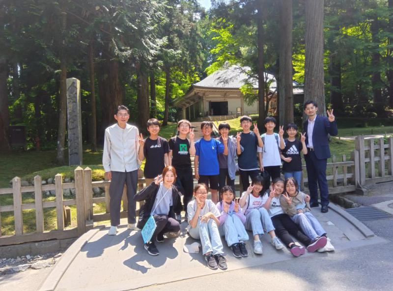 昼食を食べて、中尊寺に着きました。記念写真です。このあと金色堂を見学します