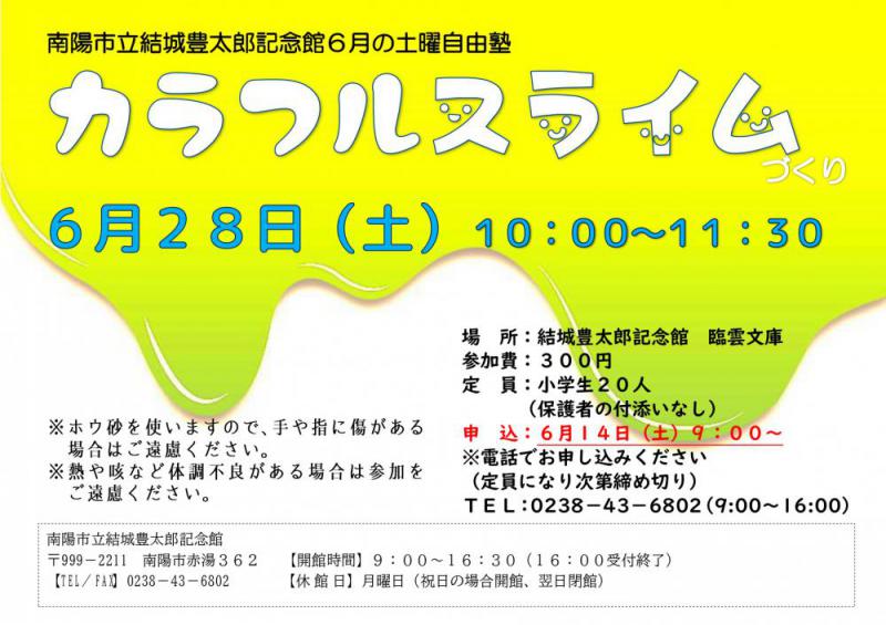 土曜自由塾は、6月〜12月の第4土曜日(変更あり)に行う小学生を対象とした講座です。つくるものは決まっていますが、その中で自分の好きなようにのびのびと楽しくつくります。 6月の土曜自由塾は カラフルスライムづくり です。申 込:6月14日(土)9:00から受付開始(電話でお申し込みください)TEL:0238−43−6802(9:00〜16:00)※定員(小学生20人)になり次第締切※ホウ砂を使いますので、手や指に傷がある場合はご遠慮ください。※熱や咳など体調不良がある場合は参加をご遠慮ください。