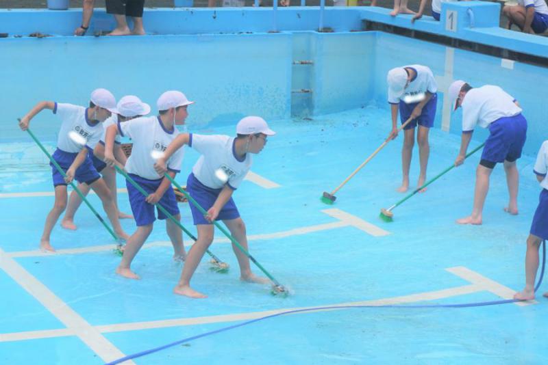 1日遅れの更新ですが、昨日(6/10)にプール清掃を行いました。技師長さんが数日前から計画的に水を抜いてくださっていましたが、最後にきて抜けきれないとのこと。昨年も最後は排水溝の鉄柵を外す作業をしたのですが、今年も…。まずは、Beforeの様子をご覧ください。高学年の子どもたちは、体育館で作業の段取りについて話を聞きます。プールの周りに樹木があるものですから、落ち葉類が蓄積し、排水溝をふさいでしまいます。解消するためには、ひたすら腐葉物質?をかき出すしかありません。子どもたちがプールサイドに到着したころには、何とかご覧のような状態に。後半は雨が落ちてきましたが、子どもたちは濡れる前に作業を終えて屋内へ。予定時間より早く終えることができました。毎年のことでありますが、高学年の子どもたちの大事な役割です。皆さん、頑張りました。そして、きれいになりました。来週の火曜日(6/17)はプール開き。運動会を終えたばかりですが、次は水泳学習です。安全で楽しい活動となることを願っています。