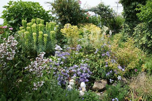 今朝は、予報より早く6時前から雨が降り出しました。庭にとっては、久しぶりの恵みの雨!暑い日が続いて、毎日の水かけも一仕事でした。すっかり梅雨の天気で湿度も高く苦手なお天気です… まだ、少し雨が降っていましたが、朝の庭をグル〜と。前回ばーばの写真をUPした日に、じーじも久しぶりにカメラで撮っていたので、ブログのUP依頼もなかったのですが、折角なので、今日の写真に・・・ばーばの写真は、明日のネタ花にすることにしました(^^) (トップ写真)はじーじの”ロックガーデン”もう競い合って伸びている状態でしょうか? ↓ここも同じく密集状態に… ”スタキスモニエリ”我が庭にもすっかり定着してきました。株分けで増やしています〜♪冬の枝折れの心配もなくラベンダーよりいいかもデス。 『赤いバラ』。。。 “岳の夢“花束のようなバラ〜!花弁の裏側は白で、かわっています。鉢植えで上手く育たず、この場所に来て2年目。ようやくきれいな花が見れたのでこの場所がいいのかな?じーじお得意の、いろんな角度で撮ってみました。 おまけに。。。”ウルメールムンスター”色は隣に植えてある“ゾンマーアーベント”とほとんど同じ ”ソレイユロマンティカ” バラも終盤、夏の庭にバトンタッチ…