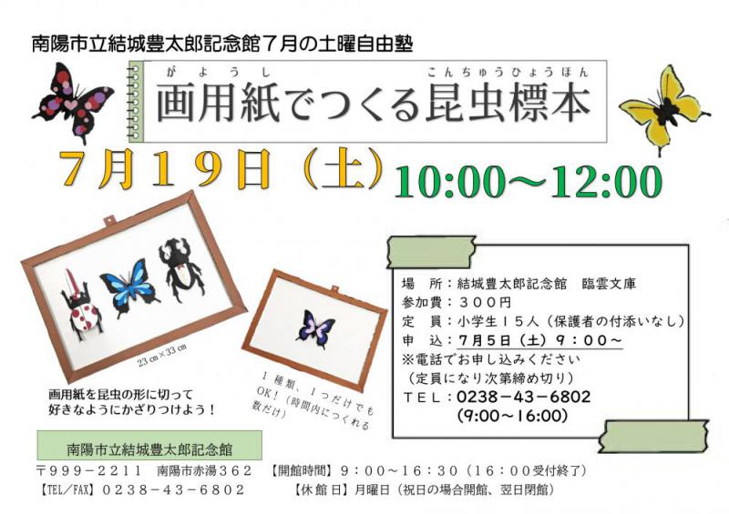 土曜自由塾は、6月〜12月の第4土曜日(変更あり)に行う小学生を対象とした講座です。つくるものは決まっていますが、その中で自分の好きなようにのびのびと楽しくつくります。 7月の土曜自由塾は 画用紙でつくる昆虫標本 です。申 込:7月5日(土)9:00から受付開始(電話でお申し込みください)TEL:0238−43−6802(9:00〜16:00)※定員(小学生15人)になり次第締切※熱や咳など体調不良がある場合は参加をご遠慮ください。 6月の土曜自由塾カラフルスライムづくり、無事に終わりました。作り方をしっかり理解して、みんな失敗なく作ることができました。むちむちぷるぷるのスライムで遊んだ後は、手を洗ってくださいね。(ラップをしないで置いておくと、水分が抜けて固くなってしまうのでラップをして保存してください。)