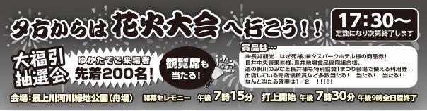 令和7年8月2日(土)に開催予定の最上川花火大会にて「ゆかたで行こう!大福引抽選会!」が行われます!ゆかたでご来場者 先着200名様を対象に17:30〜より会場内にて抽選会を予定しております! 賞品は…『タスパークホテル長井』様、『はぎ苑』様の“商品券”や、『長井中央青果(株)』様、『長井地場食品協同組合』様、『道の駅川のみなと長井』様も特別協賛!まつり会場で使える“利用券”、会場売店の協賛賞など多数当たります!なんと、当たる確率は 約1/2!! 是非、最上川花火大会当日は浴衣でご来場ください!(^^♪