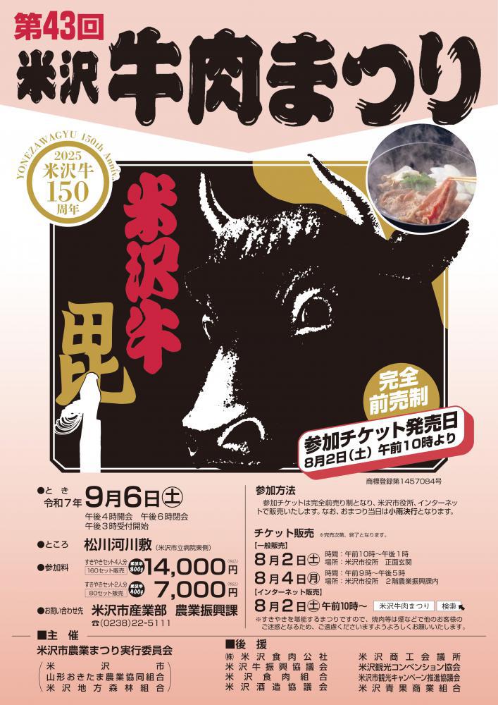毎年恒例の「米沢牛肉まつり」が9月6日(土)に開催されます!「米沢牛肉まつり」とは、松川河川敷で約900人が最高級の米沢牛を食べる一大イベントです。河川敷にずらっと並んだテントの中で、夕方から夜にかけて各々七輪を囲み、細やかな脂のさしが丁寧に入った、とろけるような味わいの牛肉に舌つづみを打ちます。 1980年から始まった「米沢牛肉まつり」は、「米沢の味ABC」の代表格である米沢牛を参加者の皆様で楽しく食して、牛肉の消費拡大と「米沢牛」の銘柄高揚を願い、開催されています。この機会に最高級の米沢牛をご堪能ください!なお、参加チケットは完全前売り制ですので、下記の参加チケット購入方法をご確認ください。◇開催日 2025年9月6日(土) 受付15:00 開会16:00 閉会18:00◇場 所 松川河川敷(米沢市立病院東側)◇参加料 すき焼きセット4人分 14,000円(税込) すき焼きセット2人分 7,000円(税込) ◇すき焼きセット内容米沢市内の畜産農家が生産した最高級の米沢牛(4人分セット800g、2人分セット400g)白菜、ネギ、糸こんにゃく、豆腐、春菊、えのき、舞茸、卵、すき焼きタレ、箸、お椀なお、野菜の生育状況によっては、内容が一部変更となる場合がございます。◇チケット販売販売日時:令和7年8月2日(土曜日)午前10時から午後1時販売場所:米沢市役所1階市民ホールオンライン購入:インターネット販売は同日10時からインターネット販売はこちらから御購入にあたっての注意点 市役所販売、インターネット共に先着順になります。 牛肉まつり当日は、チケットとセット一式が引き換えになりますので必ずご持参ください。 購入後の返金はいたしかねます。【お問い合わせ及び申し込み先】 米沢牛肉まつり部会 事務局(米沢市農業振興課) 住所:〒992-8501 米沢市金池5丁目2番25号 電話:22-5111(内線4301、4300)