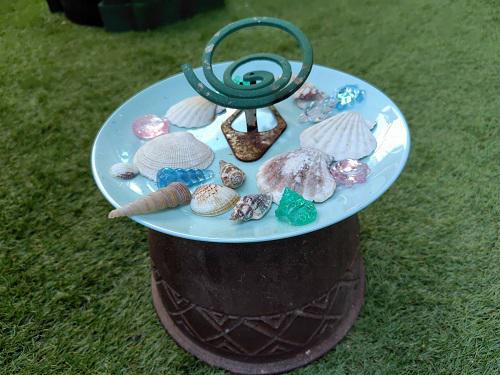 今日も、暑い、暑い、暑い、、、長井の最高気温は今年最高の37.0℃ー! いつになったら雨が降ってくれるのでしょうか? 先日お邪魔した時、「カフェテラス」に蚊取り線香が人工芝に直置きに。(台はありましたが) 以前アレンジメント教室で使用した材料と使わなくなった鉢を使って頂く事にしました(^^)今年、アジサイを鉢から地植えにしたのですが、もう使うことはないだろうの鉢です… 我が家での断捨離品を使ってもらうことで有効活用です。少しずつ鉢は、減らしていきたいと思っているのですが中々減らせないですね。バラ鉢だけは、じーじにお願いしています… (トップ写真)は。。。夏の雰囲気がバッチリ!貝もそのまま使ってもらいました。台は、鉢を逆さに利用〜♪我が庭も、逆さにした古い鉢をところどころに活用しています。 ↓鉢だけでも重量感があり、素敵に思っているのですが自画自賛でしょうか?  ↓アレンジメントのあまった貝は、多肉の寄せ植えとコラボで上手く利用〜   ↓これがアレンジメント教室のばーばの作品で〜♪趣婦の日々〜2019.09.06よりブルーのお皿が夏らしく爽やかです。懐かしい作品ですが、その後教材は使う事もなくそのままに…   ↓Kちゃんの旦那様がまた新しく多肉の棚を作ってくれたようです。センスいいですよね。  旦那様の遊び心〜    旦那様もわが夫婦と同じ高齢者ですが、このような素敵な作品を構想出来るなんて素晴らしいことですね(^^)我が家のじーじも後期高齢者になりましたが庭づくり頑張っています!