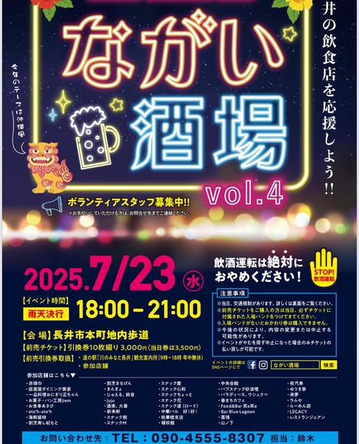 長井市でながい酒場vol.4が開催されます。日時 7月23日(水)18時〜21時会場 長井市本町地内歩道雨天決行で行われる長井のまちが飲食で盛り上がる夜、ぜひ、行ってみてください! お問い合わせ先 090−4555−8307(鈴木)