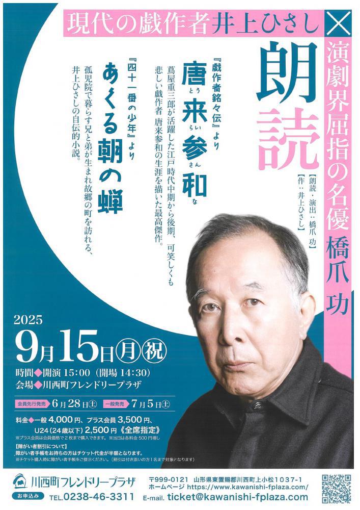川西町フレンドリープラザにて、演劇界屈指の名優橋爪 功氏による朗読が行われます。橋爪 功氏の演出により、現代の戯作者井上ひさしの作品を朗読します。ぜひ、ご来場ください!<日時>令和7年9月15日(月・祝) 開演15:00(開場14:30)<場所>川西町フレンドリープラザ<料金>全席指定一般 4,000円プラス会員 3,500円U24 2,500円<問い合わせ・購入先>川西町フレンドリープラザ TEL:0238-46-3311詳細は、チラシをご覧ください。