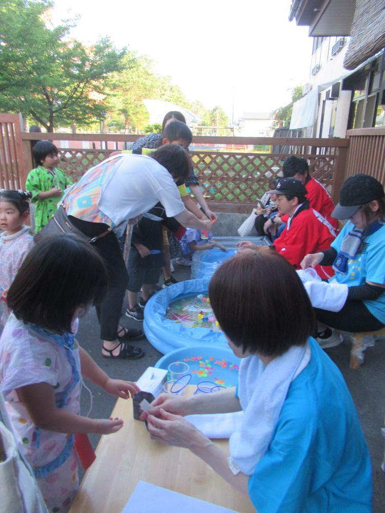 7月25日北部保育園なつまつりを開催しました。近年の猛暑を考慮し、出店、飲食スペースなどは室内に設置しました。今年度は6件のキッチンカーさんにご協力いただき、夕食からスイーツまでを楽しんでいただきました。園舎内ではおもちゃ屋さんやゲームコーナーなどの縁日の後に、お神輿かついで盛り上げてくれました。最後は外できれいな花火を見ました。