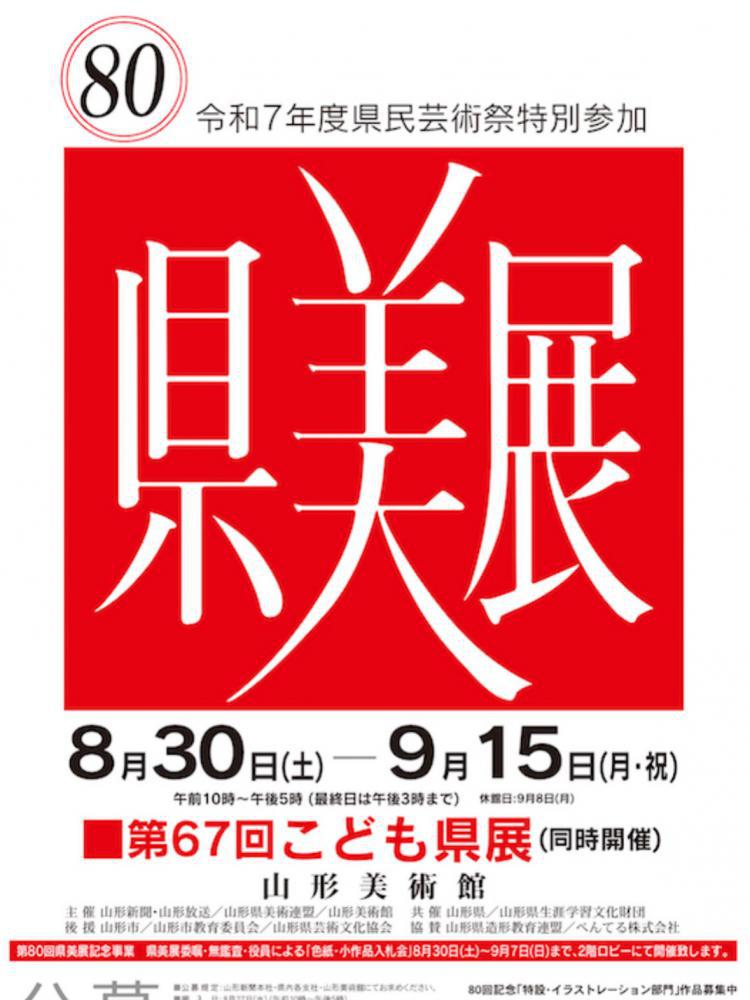 今年も山形美術館において「県美展」が開催されております。弊社からも社員3名が出品し、無事3名とも展示していただくことが決定致しました!!3名それぞれの作品は期間内中にこちらのホームページでもご紹介致しますが、ご都合よろしい方は是非、会場に足を運んでいただきご覧になってもらえれば幸いです!!