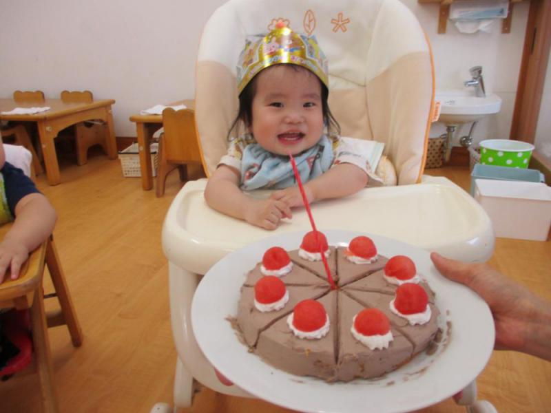 ケーキを見たり食べたりしてみんなでお祝いをしたおやつの時間です。