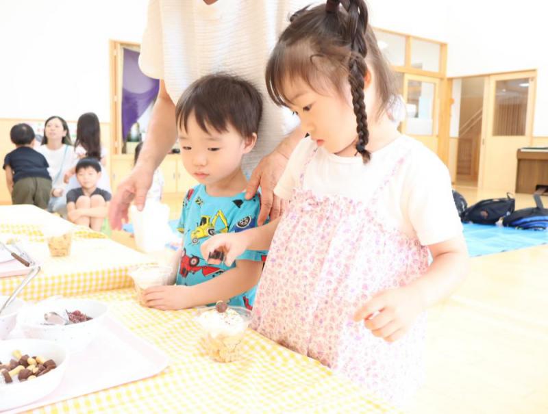 9月13日(土)に令和7年度「あいすくりーむサロン」を開催しました。当初、やきいもサロンを予定しておりましたが残暑が厳しいため、あいすくりーむサロンに予定を変更して行いました。当日は、本園にあるアイスクリームマシンを使い、手作りのバニラアイスを作り参加者をお出迎え。在園児、地域の方、小学生の13名の方が参加して下さいました。準備したバニラアイスに、自分の食べたいトッピングの材料を乗せ、自分だけのミニパフェを作り、友達と一緒にアイスクリームを食べ楽しい時間となりました。 また遊戯室にモンテソーリ教育体験コーナーを準備し、親子で楽しんでいただきました。始めて遊ぶ教具に興味津々の参加者の皆さん。一つ一つの教具に集中し楽しい時間を過ごしました。家族写真を記念品にし、フレームに入れてプレゼントをしました。参加した方は「思い出の品になりました」と喜んで帰られていきました。 今年度最後の子育てサロンが無事終了し、来年度もさらに、楽しんでいただけるような企画を行って参ります。