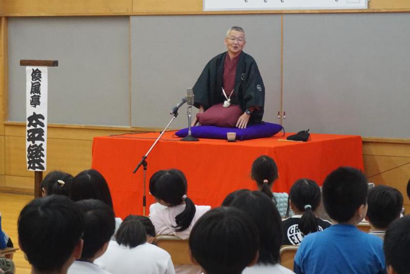 本日の3時間目に、長井市民文化会館のアウトリーチ事業として全校生で「落語」を鑑賞しました。おいでいただいたのは、長井市出身の「俊風亭太平楽」さん。お囃子での登場から大盛り上がり。高座の近くに…と声をかけていただくと、低学年の子どもたちは一斉に椅子を近づけ、興味津々に耳を傾けていました。あっという間の公演でありましたが、終始、笑い声や楽しい声が多目的ホールに響いていました。最後に感想発表を募ると、たくさんの手が挙がっていました。それだけ楽しかった、興味を引いたということですね。とても有意義な時間となりました。太平楽さんからは、長井市民文化会館で開催される独演会の紹介も。「落語」という日本特有の伝統文化に触れるとてもいい経験となった思います。実現していただいた関係者の皆様、大変ありがとうございました。
