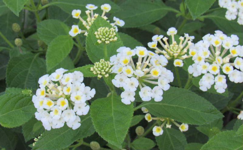 ●散歩の途中で見つけた白い花が集まった花は「スーパーランタナ」それとも「ランタナ」でしょうか 丸く集まった花の内側と外側で色が違っています 内側が新しい花でしょうか黄色味を帯びています 本当は何という名前の花でしょうか