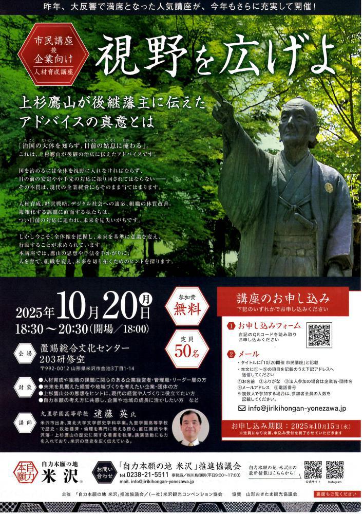 市民講座兼企業向け人材育成講座「視野を広げよ〜上杉鷹山が後継藩主に伝えたアドバイスの真意とは〜」10/20(月)開催・参加費無料!昨年、大反響で満席となった人気講座が、今年もさらに充実して開催!「治国(ちこく)の大体を知らずに、目前の姑息に掩(おお)わる」。これは、上杉鷹山が後継の治広に伝えたアドバイスです。国を治めるには全体を視野に入れなければならず、目の前の安定や小手先の対応に振り回されてはならない―。その本質は、現代の企業経営にもそのまま当てはまります。人材育成、経営戦略、デジタル社会への適応、組織の体質改善。複雑化する課題に直面する私たちは、つい目前の対応に追われ、未来を見失いがちです。しかし今こそ、全体像を把握し、未来を基準に意識を変え、行動することが求められています。本講座では、鷹山の思想や手法を手がかりに、人を育て、組織を変え、未来を切り拓くためのヒントを探ります。参加費無料ですので、ぜひご参加ください!◇開催日時 2025年10月20日(月)      18:30〜20:30(開場/18:00)◇会 場  置賜総合文化センター 203研修室      (米沢市金池3丁目1-14)◇対 象 ・人材育成や組織の課題に関心のある企業経営者・管理職・リーダー層の方・未来を見据えた経営や地域づくりを考えたい企業・団体の方・上杉鷹山公の思想をヒントに、現代の経営や人づくりに役立てたい方・自力本願の考え方に共感し、企業や地域の成長に活かしたい方 など◇定 員  50名◇講 師  九里学園高等学校 遠藤 英 氏◇講座のお申し込み1)チラシのQRコードから2)メールから・タイトルに「10/20開催 市民講座」と記載・本文に@お名前AふりがなB法人参加の場合は企業名・団体名CメールアドレスD電話番号を記載の上、下記アドレスへ送信してください。※複数人で参加する場合は、参加者全員の人数を記載してください。メール info@jirikihongan-yonezawa.jp◇お申し込み期限 2025年10月15日(水)※定員になり次第、申込み受付を終了させていただきます。【お問い合わせ】「自力本願の地 米沢」推進協議会事務局/叶島印刷(平日9:00〜17:00)TEL:0238-21-5111