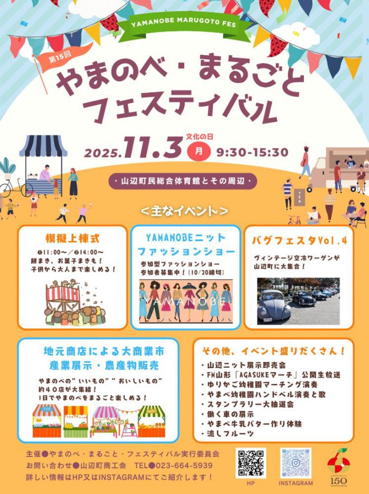 第15回 やまのべ・まるごとフェスティバル開催! 2025年11月3日は山辺町へGO!家族みんなで楽しめる一大イベント! イベント概要 開催日:2025年11月3日(月・文化の日) 時間:9:30〜15:30 場所:山辺町民総合体育館とその周辺山辺町の一大イベント「やまのべ・まるごとフェスティバル」が今年も開催されます!文化の日にふさわしい、家族みんなで楽しめる多彩なプログラムが盛りだくさん。地元の美味しいものや伝統文化に触れ、忘れられない一日を過ごしましょう。 注目のメインイベント! 模擬上棟式で餅まき・お菓子まき!開催時間:@11:00〜 / A14:00〜日本の伝統的な上棟式を模した餅まき・お菓子まきが行われます!大人も子供も夢中になること間違いなしです。ぜひ参加して、たくさんのお餅やお菓子をゲットしてくださいね。 YAMANOBEニットファッションショー山辺町が誇るニット製品の魅力を発信する参加型ファッションショーです。やまのべニットや、参加者のお気に入りのニットが会場を彩ります。※参加者募集中!締切は10月20日(日)まで! バグフェスタ Vol.4 (ヴィンテージ空冷ワーゲン大集合!)クラシックカー愛好家必見!レトロな魅力あふれるヴィンテージ空冷ワーゲンが一堂に会します。美しいフォルムと独特のエンジン音に、心ときめくこと間違いなし。写真撮影もお忘れなく! 地元商店による大商業市・産業展示・農産物販売山辺町の"いいもの"、"おいしいもの"が約40店舗大集結!新鮮な農産物や加工品、特産品などがズラリと並びます。ここでしか手に入らない掘り出し物を見つけたり、地元の方々との交流を楽しんだり、山辺町の魅力をまるごと体験できるチャンスです。 その他、イベント盛りだくさん! 山辺ニット展示即売会 FM山形「AGASUKEマーチ」公開生放送 ゆりかご幼稚園マーチング演奏 やまべ幼稚園ハンドベル演奏と歌 スタンプラリー大抽選会 働く車の展示 やまべ牛乳バター作り体験 流しフルーツ 会場アクセス場所:山辺町民総合体育館とその周辺住所:山形県東村山郡山辺町緑ケ丘1 (山辺町民総合体育館)Googleマップで開く:こちらをクリック お車でお越しの場合:詳細な駐車場情報はイベント公式サイト等でご確認ください。山辺町民総合体育館の駐車場は、無料です。 公共交通機関:JR羽前山辺駅から徒歩約17分(約1.4km)です。 よくあるご質問 (FAQ) 入場料はかかりますか?いいえ、入場は無料です。どなたでもお気軽にご参加いただけます。 駐車場はありますか?山辺町民総合体育館の駐車場、町役場の駐車場などを無料でご利用いただけます。 詳細はイベントの公式ホームページまたはSNS(Instagram)でご確認ください。駐車場は限りがありますので、公共交通機関のご利用もご検討ください。 雨天の場合でも開催されますか?原則として雨天決行ですが、荒天の場合は中止・変更となる可能性があります。最新情報は公式サイトをご確認ください。 お問い合わせ主催:やまのべ・まるごと・フェスティバル実行委員会お問い合わせ先:山辺町商工会電話番号:023-664-5939document.addEventListener("DOMContentLoaded", function() { const accordions = document.querySelectorAll('.accordion-header'); accordions.forEach(header => { header.addEventListener('click', function() { const checkbox = this.previousElementSibling; if (checkbox && checkbox.type === 'checkbox') { checkbox.checked = !checkbox.checked; } }); }); });{"@context": "https://schema.org","@graph": [{"@type": "Event","name": "第15回 やまのべ・まるごとフェスティバル","startDate": "2025-11-03T09:30:00+09:00","endDate": "2025-11-03T15:30:00+09:00","eventStatus": "https://schema.org/EventScheduled","eventAttendanceMode": "https://schema.org/OfflineEventAttendanceMode","location": {"@type": "Place","name": "山辺町民総合体育館とその周辺","address": {"@type": "PostalAddress","streetAddress": "緑ケ丘1丁目5","addressLocality": "山辺町","addressRegion": "山形県","postalCode": "990-0301","addressCountry": "JP"}},"image": ["https://yamagata-kouiki.info/images/yamanobe-marugoto-fes-ogp.jpg"],"description": "2025年11月3日(文化の日)に山形県山辺町で開催される「やまのべ・まるごとフェスティバル」完全ガイド!餅まき、ニットファッションショー、ヴィンテージカー展示、地元グルメ&農産物販売など、家族みんなで楽しめるイベントが盛りだくさん。アクセス情報や見どころを徹底解説!","offers": {"@type": "Offer","price": "0","priceCurrency": "JPY","availability": "https://schema.org/InStock","validFrom": "2025-09-01T00:00:00+09:00","url": "https://www.shokokai-yamagata.or.jp/yamanobe/"},"organizer": {"@type": "Organization","name": "やまのべ・まるごと・フェスティバル実行委員会","url": "https://www.shokokai-yamagata.or.jp/yamanobe/"}},{"@type": "Article","mainEntityOfPage": {"@type": "WebPage","@id": "https://yamagata-kouiki.info/event/yamanobe-marugoto-fes-2025"},"headline": "【山辺町】2025年11月3日開催!「やまのべ・まるごとフェスティバル」でグルメと体験を満喫!","description": "2025年11月3日(文化の日)に山形県山辺町で開催される「やまのべ・まるごとフェスティバル」完全ガイド!餅まき、ニットファッションショー、ヴィンテージカー展示、地元グルメ&農産物販売など、家族みんなで楽しめるイベ