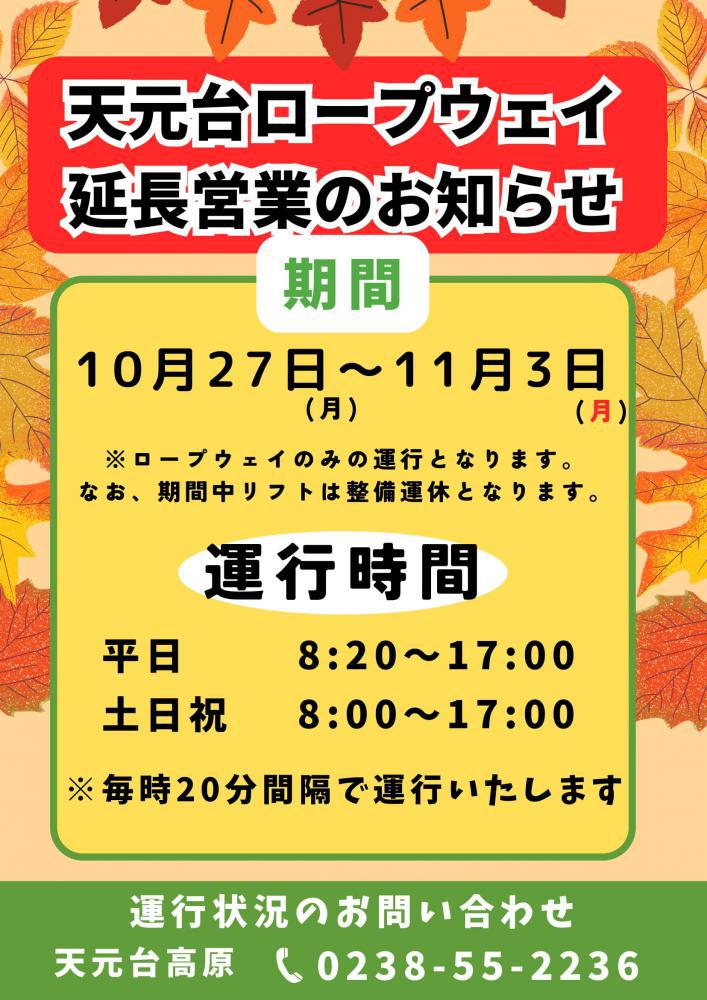 天元台ロープウェイ周辺では紅葉の見ごろが少し遅れているため、ロープウェイのみ延長営業を決定いたしました!延長期間:10月27日(月)〜11月3日(月・祝)※夏山リフトは整備のため終日運休となります。ぜひ天元台の紅葉を追加でお楽しみください!【お問い合わせ】天元台高原 TEL:0238-55-2236