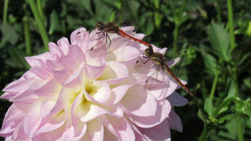 ●ダリアの花に留ったアカトンボのつがいの珍しい姿を摂ることができました 秋空のもとで川西町のダリアを見てきましたダリアがこんなにも美しい花だったことを改めて知りました 花の色や形がこんなにもたくさんの種類があること実感し秋の一日をゆったりと過ごすことができました そんな中で見つけたトンボのつがいです