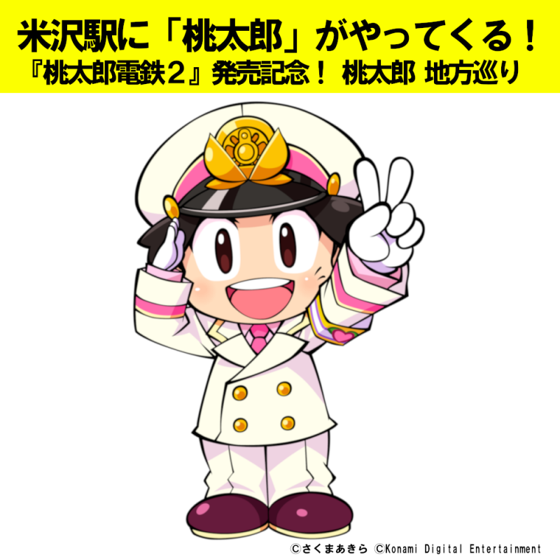 (株)コナミデジタルエンタテインメントから11月に発売される「桃太郎電鉄2 〜あなたの町も きっとある〜」に、米沢駅や米沢ゆかりの人物が登場することから、「『桃鉄2』町めぐり 桃太郎が“あなたの町”へご挨拶!?〜」と称し、「おしょうしな駅まつり2025」に桃鉄のメインキャラクターである「桃太郎」が参加、PR活動を行います!オープニングセレモニーでは桃太郎、米沢市長、米沢駅長が登壇、異色の3ショットで会場を盛り上げます!みなさまぜひお越しください!☆「おしょうしな駅まつり2025」について■開催日:10/18(土) 10時00分〜16時00分 ※雨天決行■場 所:JR米沢駅 西口駅前広場ほか■内 容:グルメ屋台(駅前商店街より出店)、縁日、駅カフェ、おたかぽっぽ制作実演、ミニ新幹線乗車体験、ペーパークラフト、ぬりえ、缶バッジワークショップ、こども駅長制服写真撮影会、キャラクター着ぐるみ登場、えきねっと相談会☆「桃太郎電鉄2 〜あなたの町も きっとある〜」について■発売日:11月13日(木)■ジャンル:ボードゲーム■対応機種:Nintendo Switch2、Nintendo Switch今作では、米沢駅で購入できる物件が新たに追加されたほか、歴史ヒーローとして上杉鷹山公が初めて登場することになりました。また、米沢駅到着時のアニメーションに「おしょうしな観光大使」であるラズウェル細木さんのイラストが採用されています!☆「『桃鉄2』町めぐり 桃太郎が“あなたの町”へご挨拶!?〜」について10時00分からオープニングセレモニーを実施し、その際に「桃太郎」より、米沢駅などゲームに搭載されたことを紹介します。「桃太郎」はその後もイベントに参加し、ゲーム内にも登場するおたかぽっぽや米沢牛などのPRを行う予定です。◆「『桃鉄2』町めぐり 桃太郎が“あなたの町”へご挨拶!?〜」に関する問合せ先:米沢市産業部観光課(観光企画担当)TEL:0238-22-5111(内線4204・4200)※「おしょうしな駅まつり2025」の詳細についてはこちら 、「桃太郎電鉄2 〜あなたの町も きっとある〜」についてはこちらをご覧ください。