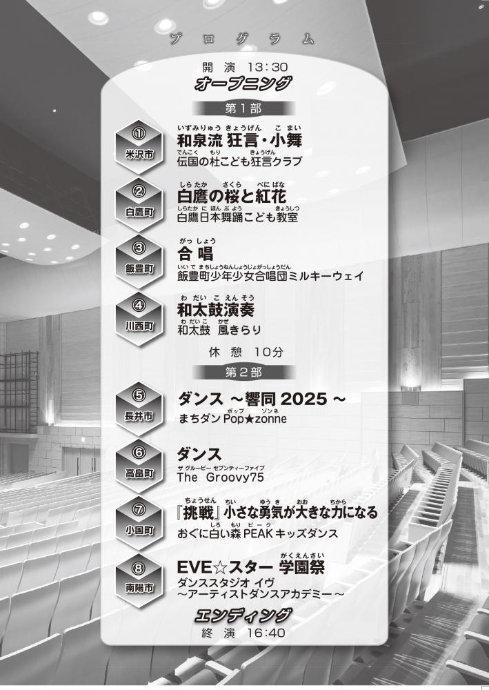 令和7年10月25日(土)開催の「置賜こども芸術祭2025舞台芸術部門」について、当日のプログラムをお知らせします。13:00  開場13:30  開演13:32〜 伝国の杜こども狂言クラブ(米沢市)13:55〜 白鷹日本舞踊こども教室(白鷹町)14:10〜 飯豊町少年少女合唱団ミルキーウェイ(飯豊町)14:35〜 和太鼓 風きらり(川西町)休憩(10分程度)15:05〜 まちダンPop★zonne(長井市)15:26〜 The Groovy 75(高畠町)15:51〜 おぐに白い森PEAKキッズダンス(小国町)16:16〜 ダンススタジオイヴ(南陽市)16:40〜 エンディング(各団体代表者によるスピーチ)16:50〜 終演※上記の時間は予定であり、各団体の演目開始時刻は前後する場合があります。各団体の演目は、画像をご覧ください。
