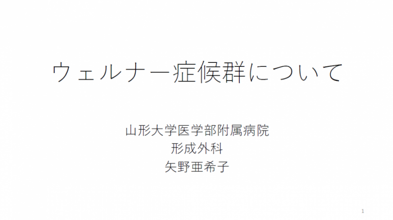 4つ目は、山形大学形成外科 矢野 亜希子 先生の「ウェルナー症候群について」の講演資料です。