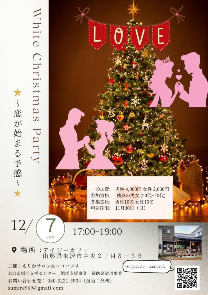 婚活イベント、ホワイトクリスマスパーティーが開催されます。 日時:2025年12月7日(日曜日)17:00〜19:00場所:デイジーカフェ(米沢市中央2-8-36)参加対象 独身の男女(20代〜40代)募集定員 男性:10名 女性:10名申込み期限 11月30日(日曜日)参加費 男性:4,000円 女性:2,000円問い合わせ先 主催:えりかサロン&ココハウス(担当:高橋)電話番号:080-5221-5934Mail  sumire969@gmail.com 申込期限間近、ぜひ、参加してみてください〜