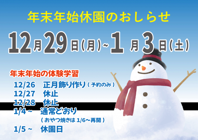 【年末年始 休園のお知らせ】いつも西沼田遺跡公園をご利用いただき、誠にありがとうございます。誠に勝手ながら、下記の期間を年末年始の休園日とさせていただきます。■ 休園期間2025年12月29日(月)〜2026年1月3日(日)新年は 2026年1月4日(日)より開園 いたします。※「味噌作り体験」「腰機マフラー体験」の申込みは1月4日 9:30〜受け付けます。皆さまにはご不便をおかけいたしますが、何卒ご理解賜りますようお願い申し上げます。