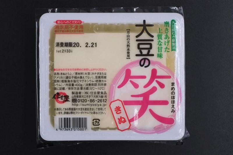 まじめにまじめに作ったら、とってもユニークな絹ごし豆腐ができました。1)まじめどうふ 手間暇をかけた昔ながらの製法で作りました。 一番のポイントは、《豆乳を凝固させる工程》にあります。 効率がよくて数多く作れる方法ではなく、 職人の手を使い、長年の技術が要するといわれている「高温凝固」を採用しています。 この昔ながらの高温凝固は低温凝固よりもコクと甘みがでます。 高温(約70℃前後)で豆乳とにがりをあわせ、一気に攪拌し固めますが、 凝固の反応速度が速いため、いわゆる豆腐職人の技です。2)ユニークな食感 この新しい食感を上手に例える言葉が見つかりません。 普段食べているツルツルした絹ごし豆腐を想像して食べた方は、 驚いてしまうかもしれません。 舌によく絡むので、接着する面積が広い分、通常の豆腐よりも味を強く感じます。3)食べ方のコツ? 豆腐本来の味を味わいたい方は、 醤油ではなく少量のお塩で食べるのがオススメです。〈商品名〉 大豆の笑(まめのほほえみ)きぬ〈名称〉 きぬとうふ〈原材料〉 大豆(カナダまたはアメリカ・遺伝子組み換えでない) 豆腐用凝固剤(粗製海水塩化マグネシウム・硫酸カルシウム)〈内容量〉 400g〈保存方法〉 要冷蔵(5℃〜10℃)→「大豆の笑(まめのほほえみ)きぬ」ツインパック