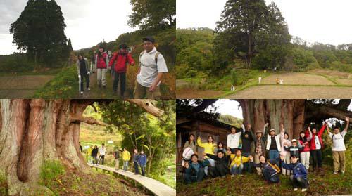 まわりの水田は、大杉にちょうど良い水気を与えるため、元住民の佐竹幸雄さんが欠かさず作っていらっしゃるそうで、とても素敵な風景を作り出しています。集合写真を撮り、芳名帳に記名していると、ついに雨がパラパラと落ちてきたので、なごり惜しく大杉をあとにしました。