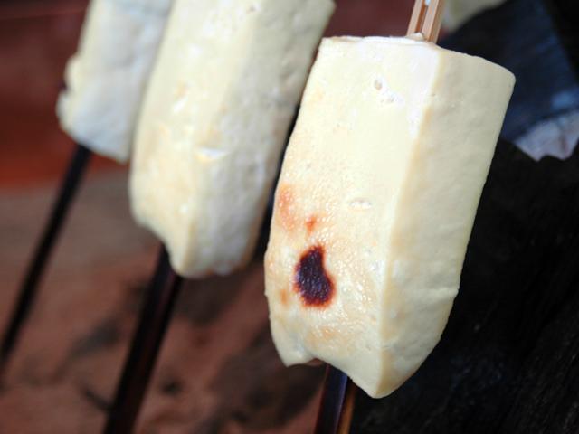 炭で焼いたこだわりのお豆腐は、外はアツアツで香ばしく、中はふわふわのしっとり。後味にはしっかり大豆の風味が香ります。