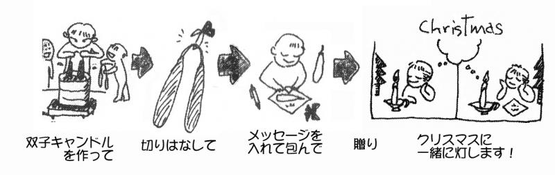 溶かしたろうに糸を何度も浸して「双子(ツインテーパー)キャンドル」を作り、切り離し、一本は自分用にします。クリスマスイブに灯しあうことができます。