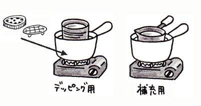 ディッピング用の缶はコーヒー豆や粉ミルクの缶など高さが10cm以上のもの。補充用は手鍋だと注ぎやすいです。卓上ガスコンロは汚れてもいいようにアルミホイルで覆いましょう。