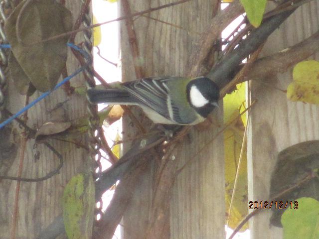 あたり一面の雪なので、わずかに残った葉っぱに野鳥が集まってきました。事務所の戸の前を中から写真を撮りました。