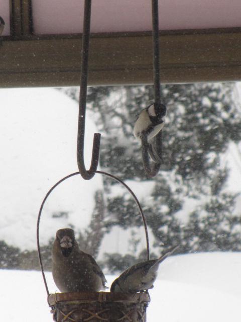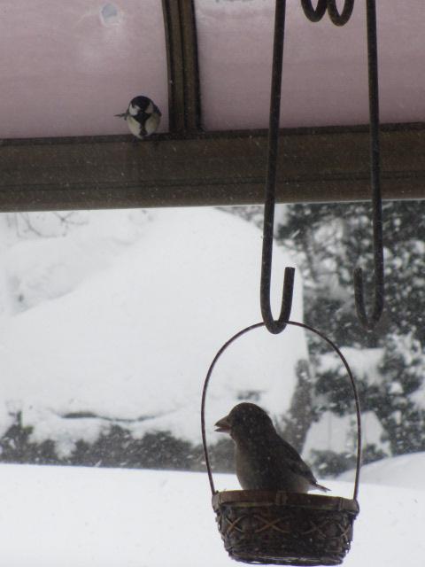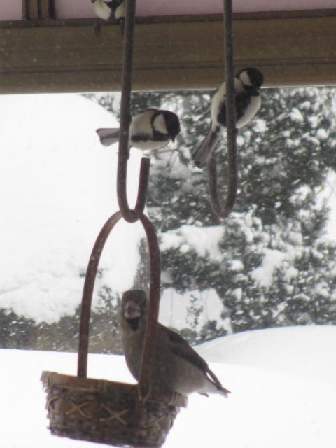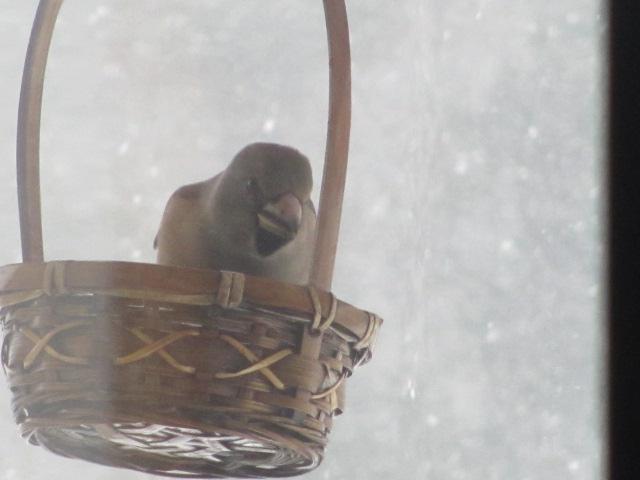画像が不鮮明ですみません。窓越しで、吹雪で、籠も揺れているのです。距離は3メートルぐらい、すぐそこにいます。