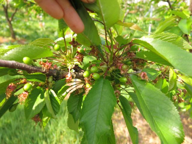 この青い粒が実になるのですが、これが実に成長すかどうかは、まだ確定ではありません。今年は大変心配していますが、この木に限っていえば、よく実が付きそうです。