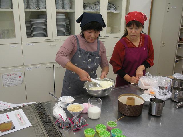 一昨日の話になってしまいますが、米沢の東部コミュニティセンターで米粉の料理教室に参加してきました。 この日の講師は川西町のまっすぐ屋さん まっすぐ屋さんは農産物の加工品を製造しており、中でもシフォンケーキは有名 この日作るのはそのシフォンケーキと抹茶の蒸しパン米粉団子の3品 たくさんの女性陣の中に混じってのケーキ作りはなかなか楽しいものだ シフォンケーキというと一般的にベーキングパウダーを使うレシピが多いが、今回は使用しないとのこと まずはシフォンケーキ 白身が多めの配合でメレンゲのみでふわふわにするとのことでした。 ケーキ作りは体力がいる メレンゲの泡立てもけっこう疲れる(~_~;) 材料を合せていざオーブンへ! この焼きあがるまでの時間がケーキ作りの一番の楽しみでしょうな! 今度は蒸しパン 実は蒸しパンを作るのは初めて だが、材料を混ぜて蒸し器で蒸すだけ 言葉にすると簡単だが、けっこう簡単だった 最後は団子 白玉粉と米粉を約半々くらいに混ぜてお湯の中へ その間シフォンケーキと蒸しパンが完成 団子が茹で上がりこれで全部出来た! さあ、いよいよ試食! シフォンケーキは見事にふわふわ! 蒸しパンももちもちとした食感 団子も白玉粉だけよりもモチモチ感が増す いや〜米粉ってすごいなあ・・と改めて実感しました! 次回の教室にも参加しま〜す!!