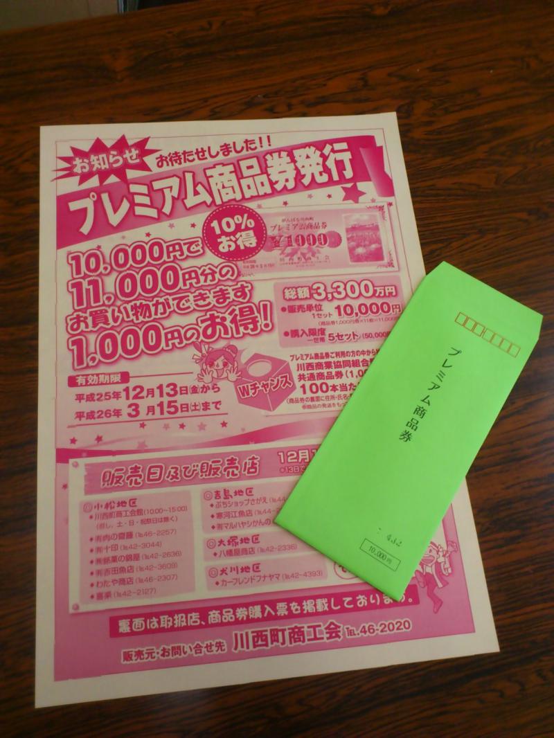 10%のプレミアムの付いた「がんばる川西町プレミアム商品券」を現在好評発売中です。使用期限は平成26年3月15日(土)、一世帯5万円まで購入可能です。