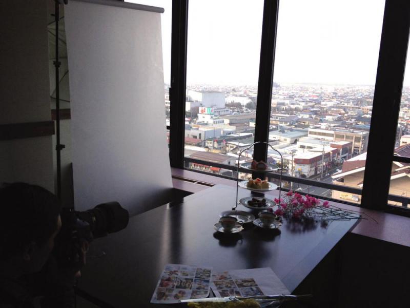 昨日新しいプランの料理撮影を行いました。こちらはその中のひとつ、10階にある食事会場「彩花亭」でケーキと紅茶のセットの撮影です♪手前には、こんな写真にしたい!と思っている参考写真の一覧。 雪ふる天童ですが、1年を通して使える写真にするためにちょこっとアレンジした写真になる予定です♪写真が届くのは明日!さて、どんな写真になっているでしょうか♪楽しみ、楽しみ♪新しいプランもお楽しみに!美味求真の宿 天童ホテル 公式HP