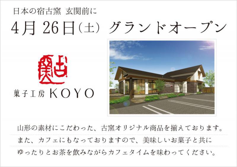 来月4月26日より古窯の目の前にカフェがオープンします!古窯の専属パティシエが集うこのカフェは、山形の素材にこだわった古窯オリジナル商品を揃えております。宿泊者はもちろんのこと独立した店舗となっておりますので地元のお客様にも気軽にお立ち寄りいただければ幸いです。美味しいお菓子やケーキと共にゆったりカフェタイムを味わってみてはいかがでしょうか。詳細の商品情報などは情報が入り次第、随時配信してまいりたいと存じます。『菓子工房KOYO』をよろしくお願い申し上げます。-------------------------------------------------