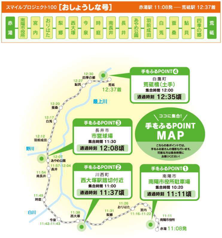 [フラワー長井線沿線情報]★フラワー長井線に手をふろう!! スマイルプロジェクト100★★★第2回目は 5月31日(土) テーマ「おしょうしな」 )開催、参加者大募集!!★★連日の好天で置賜も初夏の装い・・・水を張ったたんぼには「早苗」が元気よく顔を出し始めました。列車から見える初夏の景色は、春とは違った風情を感じることができます。【列車への乗車!!・・それとも、沿線から列車へ手をふろう】農作業中のみなさんも、是非列車へ手を振ってみてください。春の感動を・・再び多くの方と共有しましょう!!「スマイルプロジェクト100」とは フラワー長井線は100周年を迎えました。 これまで支えていただいた地域の方々、そしてこれからもご利用いただく皆様と一緒に、お祝いをすると共に更なる発展を目指して 「フラワー長井線スマイル プロジェクト100」を立ち上げました。 このプロジェクトは、沿線から列車に手を振るスマイルプロジェクトをメインに、地域プロモーションビデオやイメージソングを制作し インターネットなどを活用した広報によってフラワー長井線を発信しPRしていくものです。 100周年のお祝いや感謝、そして観光でいらしたお客様への歓迎やおもてなしの気持ちを一緒になって伝えていきましょう。赤湯〜白鷹荒砥まで・・フラワー長井線沿線で手をふろう!!★川西町は、西大塚駅舎周辺で手をふります。ご協力いただける方は、西大塚駅舎へお集まりください。もちろん、どなたでもご参加いただけます。目立つ格好や横断幕、パフォーマンス等大歓迎です!! 集合時間 午前11時 (西大塚駅舎) 列車通過時刻 午前11時37分頃 このプロジェクトは、フラワー長井線が走っている2市2町で同時開催されます。 南陽市、長井市、白鷹町、川西町、の各「手をふるポイント」でたくさんの方のご参加をお待ちしております。 詳しくは、チラシまたは「スマイルプロジェクト100」のWEBサイトをご参照ください。▼スマイルプロジェクト100のWEBサイトはこちら ★http://www.smileproject100.com/index.html★YouTube(フラワー長井線スマイルプロジェクト・列車に手をふろう!!)