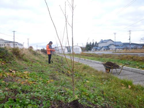羽前小松駅の東口に、イザベルを建立し、芝桜を植え、八重桜を定植して春には、近くのソメイヨシノの開花から、1か月間もサクラが楽しめる広場にする計画を実行しました。H&C財団助成事業の最後の取り組みは、11月の最後の日曜日、幸い冬型に入る直前の小春日和を利用して終了しました。