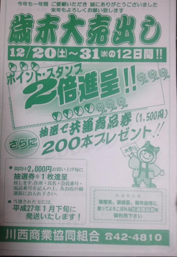 本日より12月31日まで川西商業協同組合各店舗では歳末大売り出し 開催します!!! たまるんポイント、スタンプ2倍さらに2000円お買い上げごとに抽選券を1枚進呈商品券が全部で200本当たります年末年始のお買い物はぜひ川西町で!!! プレミアム付き商品券は当店でも販売しておりますぜひこの機会にお得な商品券をお使いください!!!