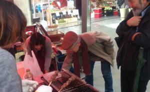 今年最後の杉並区高円寺コミュニティーマーケット「座の市」は、南岸低気圧の影響で午後から氷雨降る生憎の天候となりました。今回は日立環境財団の神山様や、明大土曜会の半田様、米沢様など、悪天候にも関わらず初めてお越しいただいた方々や、前回のいも煮や牛串に惚れ込んで、再びお出でくださった方々など、行列が出る賑わいになりました。特に、”米沢牛の牛串は絶品”とのお褒めを何度もいただきました。次回も持参いたします。また、次回はワイン地鶏のソーセージ焼きももっていきますよ。えツ、写真にはお客があんまり写っていないって?お客さんがいっぱいの時は、写真を取ってる暇がないんですよ、ほんとに。