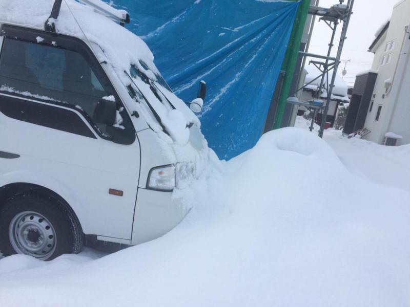 山形のサイディング塗り替えは水戸部塗装へ!シーリング隊長です。 しかし降ります&寒いです。 現場に着いてわずか1時間ほどで車も埋もれます…。朝のうちは昨日の夜と全く変わり無かったのですが。 施工中のK様アパート。ウレタン防水をかける前に最期の検査。 散水して下に漏れてこないかのチェック。片方の階段は翌朝来たら、軒天材ににじみが出てきていて再度チャレンジ。 もう1度施工し直して、2回目は無事止水に成功しました。 今日はもう片方の階段の散水試験。撒いたそばから凍ります…。 止水出来てると良いんだけど。結果は明日行ってみて!