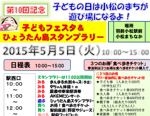 5月5日の子どもの日。恒例となった「子どもフェスタ&ひょうたん島スタンプラリー」を、羽前小松駅前及び小松地区商店街で実施します。今年のメイン企画は「3倍お得な食べ歩きチケット」。これまでは、参加料ナシのスタンプラリーで、希望者にのみ食べ歩きチケットの販売を行っていましたが、今年は参加料の代わりに「食べ歩きチケット」を購入していただきます。助成金や補助金だけに頼らない、「自立する活性化事業」への挑戦です。それでは、3倍お得の中味ですが、その1は食べ歩きチケット100円分でおおよそ10〜20%お得なお買い物。例えば、550円のラーメンが500円とか、120円のおまんじゅうが100円のように、協賛各店舗でのお得なお買いものが第一の魅力。2つ目は、子ども200円、大人400円のチケットですが、子どもと大人1名ずつの親子券なら500円、大人2名子ども2名の家族券なら900円と、家族や知り合い、お友達など大勢でおいでになるとお得が2倍になります。そして3つ目は、全部で16あるチェックポイントのうち、8つ以上のスタンプを集めると1回の抽選、16全部を回りきると2回の抽選ができて、空くじなしの賞品が当たります。当りは20賞品。米沢牛やお菓子セット、お米やひょうたん島オルゴールなど、参加各店舗の協賛により豪華賞品が用意されています。その他に、置賜農業高校吹奏楽部のミニコンサート、NCV(ケーブルテレビ米沢)のキャラクター9ちゃんに変わる新キャラクターのパフォーマンス、恒例手話の癒し系歌手AKEMIコンサートが駅前イベントとして開催されます。また、焼きそば、焼き鳥、焼きソーセージなどのフードコートや、置農ジャムやジュースなどの特産品販売。ポーニーやウサギと遊べるミニ動物園。竹トンボ作りやゲームが楽しめるお祭り広場などなど羽前小松駅周辺は子どものお祭りになります。さらにさらに、ひょうたん島資料館になっている5店舗の他、協賛店8店舗の計13店舗では、店頭でのゲームやクイズ、割安賞品を準備して良い子の来店をお待ちしています。なちなか交流プラザ「ござ〜れ」では、置農茶道班がお抹茶とおいしいお菓子を準備してのおもてなしもありますよ。みなさん、小松の町中が子どもの遊び場になる、子どもフェスタ&ひょうたん島スタンプラリーにきてけろな。