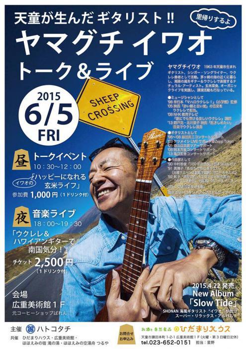 6月5日(金)美術館を会場に【天童が生んだギタリスト!! ヤマグチイワオのトーク&ライブ】が開催されます。昼の部はオーガニックライフのトークイベント、夜の部はウクレレ&ハワイアンギターの音楽ライブです。どうぞお楽しみに〜♪
