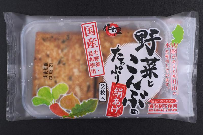 国産野菜と昆布が入った絹揚げです。〈商品名〉 野菜と昆布のたっぷり絹あげ〈内容量〉 2枚